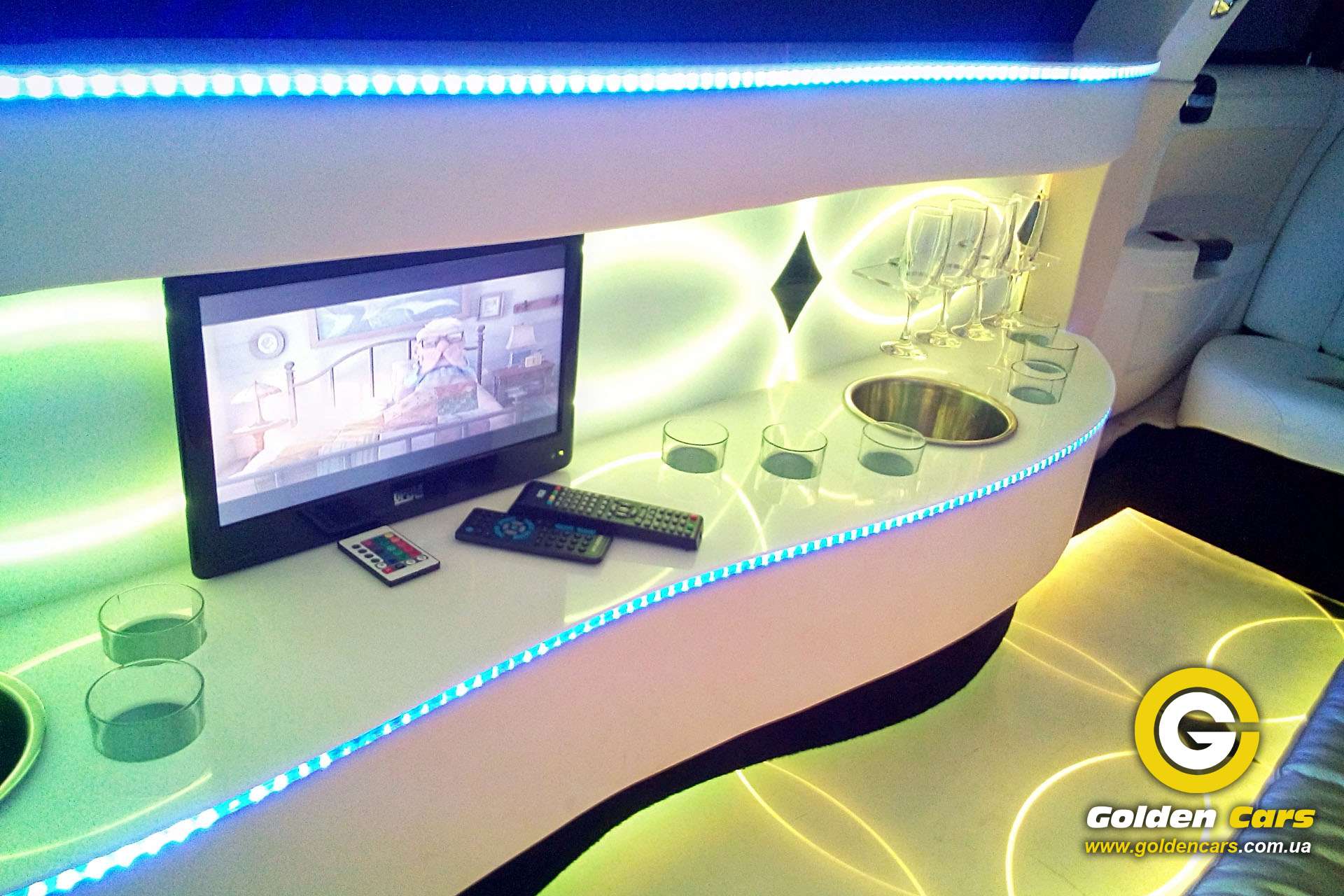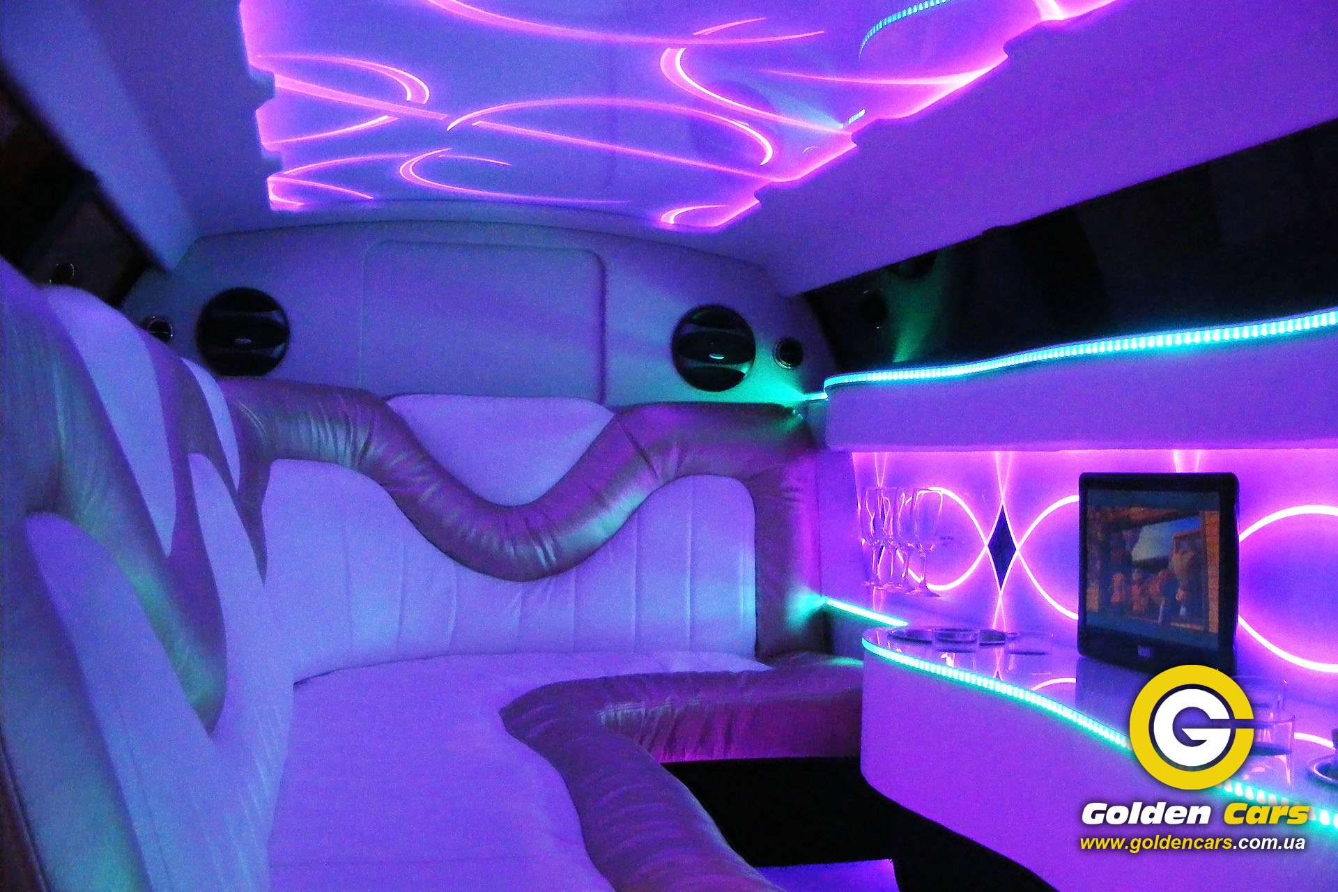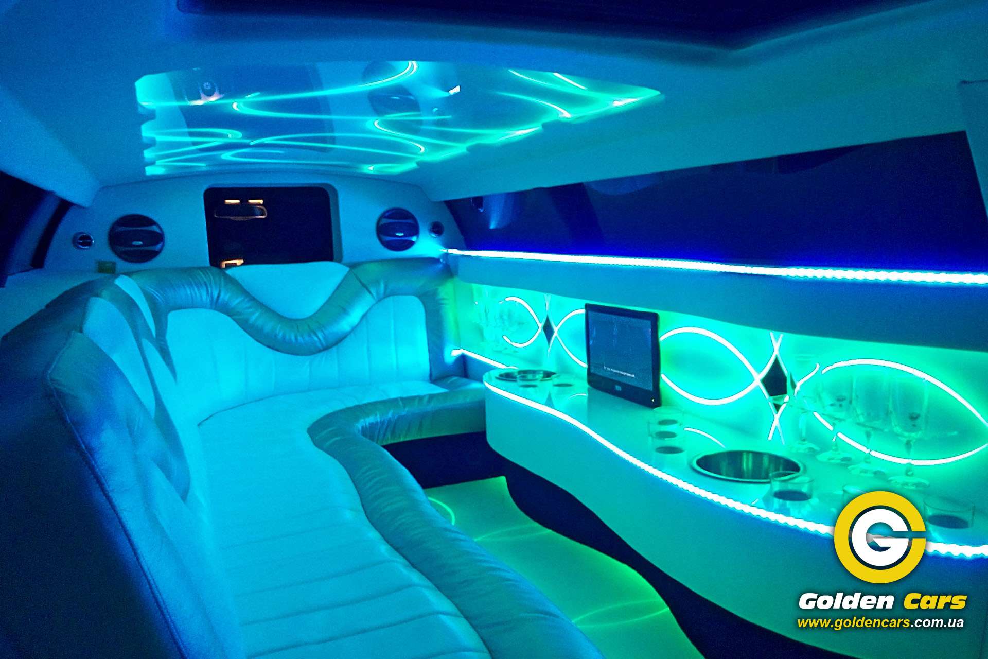 Длина лимузина 9 метров, эксклюзивный салон, диско бар, диско пол, диско потолок, выбор цвета подсветки всего салона,TV, DVD, MP3,MP4, флеш накопители, дополнительный кондиционер и печка, тонировка, перегородка с водителем, наружные габаритные огни на панорамном стекле, люк.